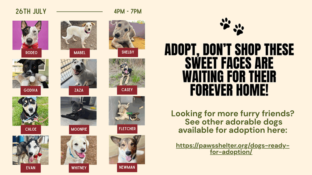 Join us Saturday, July 26th for an afternoon of adoptable pups, local vendors, and community fun with @pawsshelter and Lakeway Nights Market!