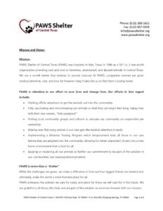 PAWS Mission and Vision by Michelle Bender|Published 24 August, 2020 Share this: Email a link to a friend (Opens in new window) Email Share on X (Opens in new window) X Share on Facebook (Opens in new window) Facebook Share on Pinterest (Opens in new window) Pinterest Share on Tumblr (Opens in new window) Tumblr